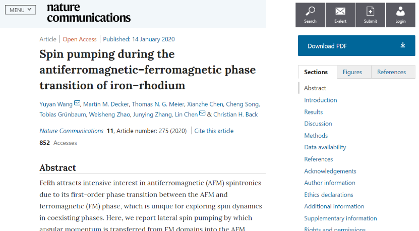 近日,Nature Communications在线发表了北航物理学院王钰言助理教授与慕尼黑工业大学、清华大学合作的有关反铁磁自旋泵浦效应的研究成果“Spin pumping during the antiferromagnetic–ferromagnetic phase transition of iron–rhodium”[Nat. Commun. (2020) 11: 275],北航物理学院为第一通讯作者单位。该研究工作得到德国洪堡学者基金、国家自然科学基金、德国科学基金等项目的资助。