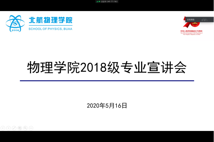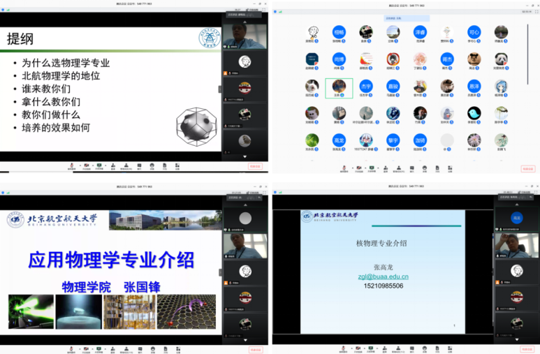 为了进一步提升学生对学院专业认知,做好2018级本科生专业选择服务工作,促进今后教学科研工作的顺利开展,助力培养具有“空天报国,敢为人先”的优秀学子,我院于5月16日在腾讯会议平台召开了物理学院2018级专业宣讲会,本次宣讲通过教授专业介绍、学生专业分享两个模块分别对学院物理学、应用物理学、核物理三个专业进行了丰富且全面的介绍与说明,物理学院2018级本科和致真书院2019级本科110余名学生参加了此次宣讲会。