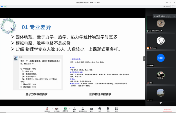 专业介绍结束后,学院在读本科生杨修远、王犇、程强军分别从自身学习经历出发,介绍了在物理学、应用物理学、核物理专业的学习体会及未来发展的规划,并以课程安排、学分设置为例,详细介绍了三个专业的不同点和交叉点,进一步加深了学生们对于三个专业的理解。