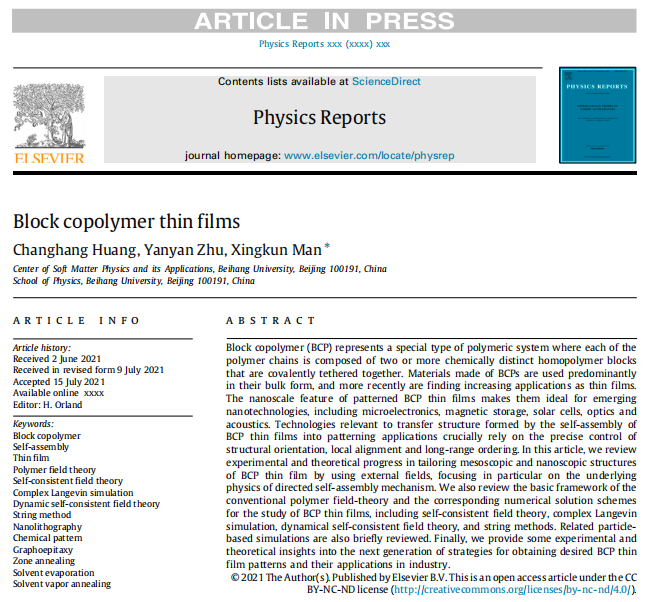 近日,北航物理学院满兴坤教授团队在物理学著名综述期刊《Physics Reports》(影响因子:25.6)上发表题为《Block Copolymer Thin Films》的综述文章。北航物理学院博士生黄昌杭和朱艳艳分别为第一和第二作者。北航满兴坤教授为唯一通讯作者,北航物理学院为通讯作者单位(文章链接:)。