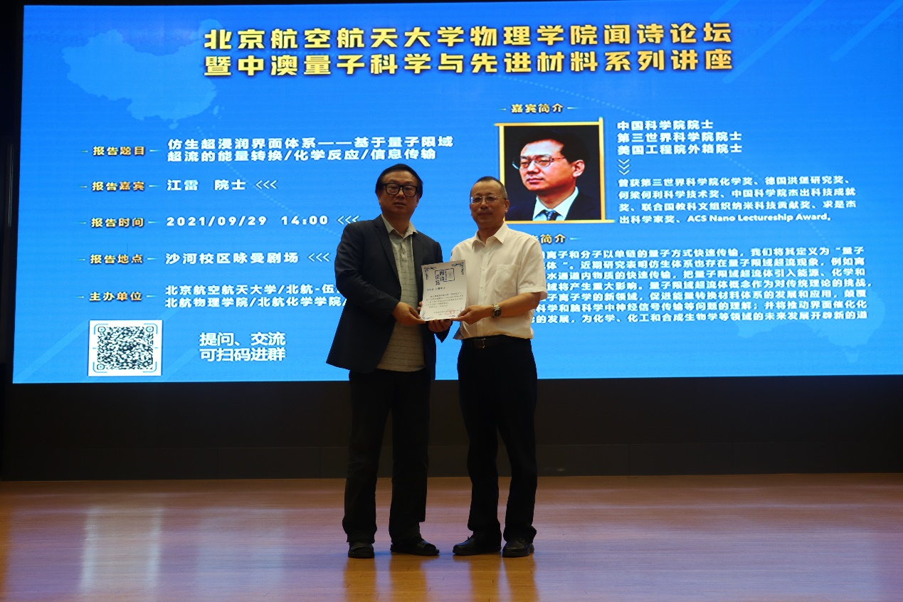 2021年9月29日下午,北京亚洲成人在线一二三四五六区物理学院在沙河校区咏曼剧场成功举办“闻诗论坛第八讲”暨“中·澳量子科学与先进材料系列讲座第三讲”。本次论坛有幸邀请中国科学院院士、第三世界科学院院士、美国工程院外籍院士江雷教授作为主讲人。