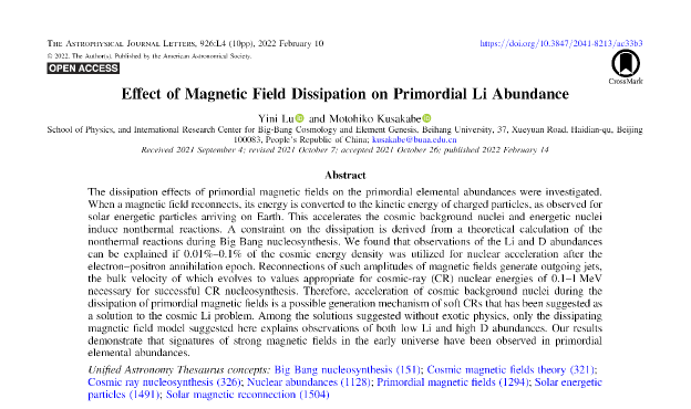 近日,物理学院天体物理理论团队在《The Astrophysical Journal Letters》期刊在线发表了题目为“Effect of Magnetic Field Dissipation on Primordial Li Abundance”的论文。硕士生陆漪妮为第一作者,日下部元彦副教授通讯作者。论文链接(http://iopscience.iop.org/article/10.3847/2041-8213/ac33b3)。