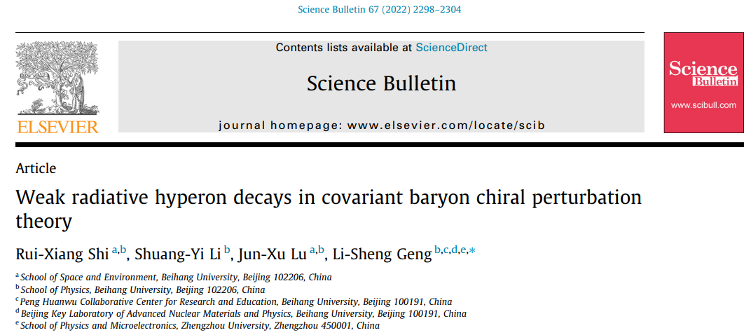近日,北航物理学院耿立升教授团队在超子弱辐射衰变研究中取得重要进展,相关成果以“Weak radiative hyperon decays in covariant baryon chiral perturbation theory”为题,于2022年12月2日发表在中国卓越计划领军期刊《Science Bulletin》上。