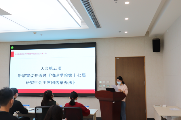 会议听取审议并通过了研究生会成员叶萍宣读的《物理学院第十七届研究生会主席团选举办法》。