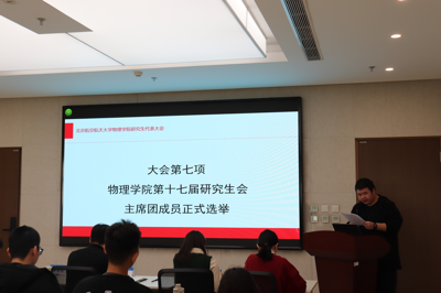 随后,大会进行了物理学院第十七届研究生会主席团的选举工作,候选人王孝龙、杨乔锋两位同学分别上台从个人优势、工作设想等方面进行了选举展示。会议选举杨乔锋、王孝龙为物理学院第十七届研究生会主席团成员。