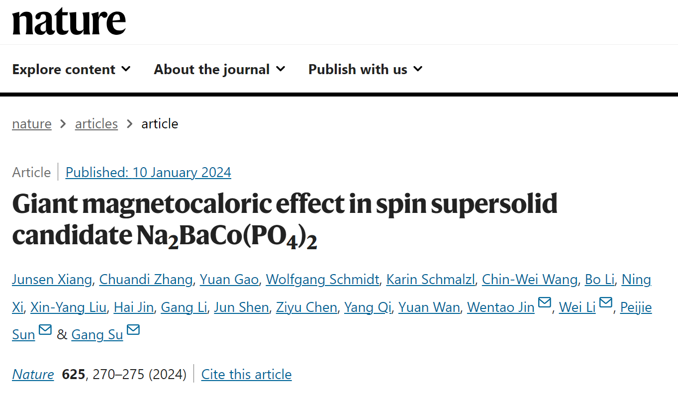 近年来,在阻挫量子磁性材料中探索新奇量子物态及其潜在应用一直是凝聚态物理前沿的一个重要研究方向。近日,北京亚洲成人在线一二三四五六区物理学院量子磁性与拓扑物理研究团队金文涛副教授课题组,联合中国科学院物理研究所孙培杰研究员、中国科学院理论物理研究所/彭桓武科教合作中心李伟研究员、中国科学院大学苏刚教授等研究团队,将高质量单晶生长、极低温热力学测量、中子衍射实验、量子多体理论计算等方法有效结合,在钴基三角晶格材料Na2BaCo(PO4)2中首次发现了自旋超固态这一新奇量子物态的存在,并观察到由此导致的、可实现极低温制冷的巨磁卡效应。该项研究成果于2024年1月10日发表在国际学术期刊《Nature》,标题为“Giant magnetocaloric effect in spin supersolid candidate Na2BaCo(PO4)2”。金文涛副教授、李伟研究员、孙培杰研究员、苏刚教授是该论文的共同通讯作者;项俊森博士(北航物理学院博士毕业生)、北航物理学院博士生张传迪、北航物理学院-理论物理所彭桓武中心博士生高源是该论文的共同第一作者。