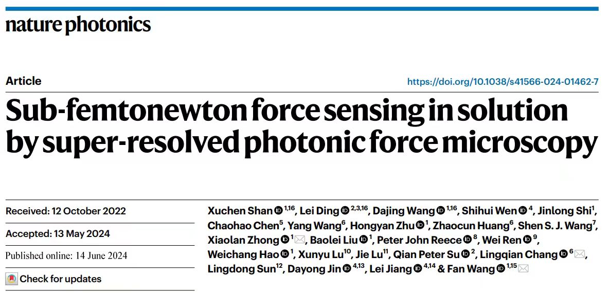 该项多学科交叉的研究成果相关工作以“Sub-femtonewton force sensing in solution by super-resolved photonic force microscopy”为题,发表于最新一期的《Nature Photonics》 上。北京亚洲成人在线一二三四五六区为唯一通讯单位。