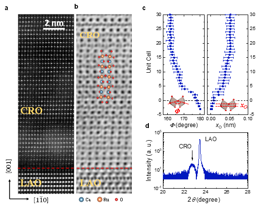 图1 CaRuO3/LaAlO3异质结的扫描透射电子显微镜图像及八面体倾转分析