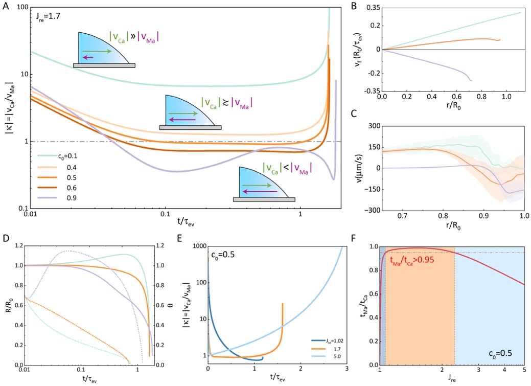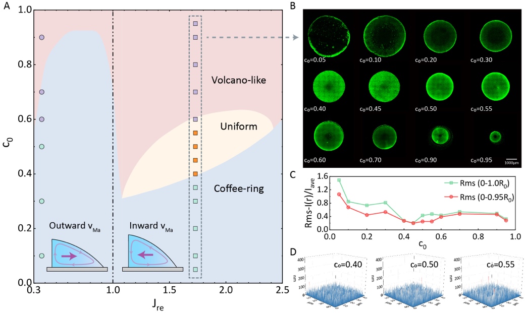 理论计算指出通过精确调控初始溶剂的体积分数比,可以实现了毛细流与马兰戈尼流的协同调制作用,使沉积形貌呈现从咖啡环到均匀沉积再到火山形的可控转变。具体来说,通过改变初始溶剂的体积分数比c0,调控了毛细流和马兰戈尼流的强度比|κ=vCa/vMa|;通过选取不同蒸发速率比Jre的溶剂,调控了毛细流和马兰戈尼流的协同作用时间tCa/tMa。