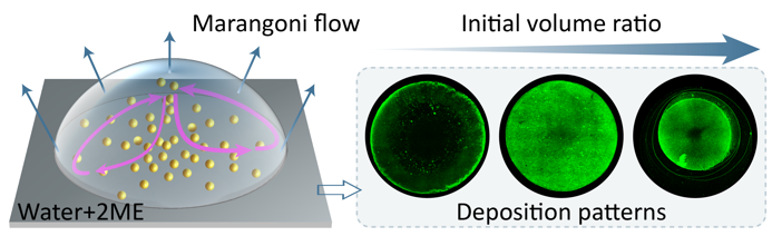 本研究提出的基于马兰戈尼效应的协同调控策略具有独特优势:通过蒸发诱导的溶剂浓度梯度产生马兰戈尼流,仅需调节二元液滴的初始体积比即可精确控制液滴内部的流场强度,无需复杂的化学改性/修饰或严苛的环境条件。这一研究为喷墨打印、微纳器件制造和生物医药等领域的图案化均匀沉积提供了简单可靠的解决方法,在规模化生产和实际应用中展现出重要价值。