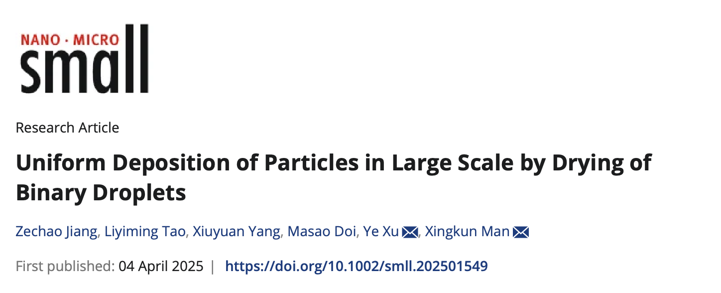 近日,物理学院满兴坤教授课题组与机械工程及自动化学院徐晔教授课题组等合作,在实现大面积可控均匀沉积领域取得了重要研究成果。相关成果以“Uniform deposition of particles in large scale by drying of binary droplets”为题发表在期刊《Small》上。物理学院博士研究生姜泽超和机械工程及自动化学院博士研究生陶郦祎铭为共同第一作者,满兴坤教授和徐晔教授为共同通讯作者。