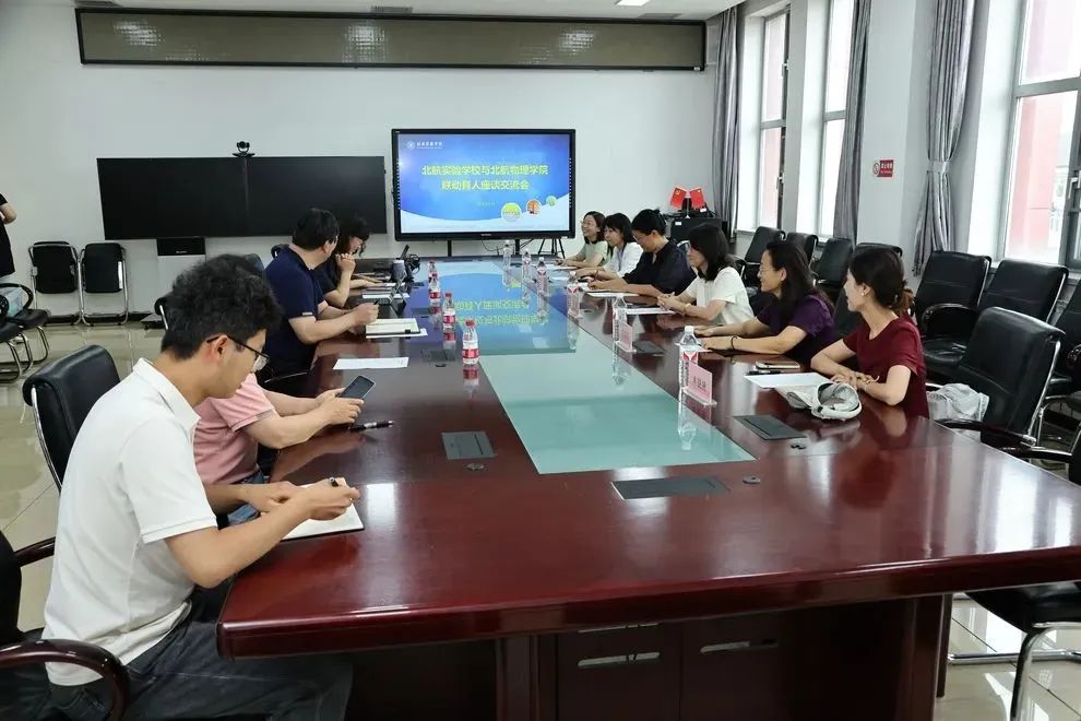 7月11日,北京亚洲成人在线一二三四五六区物理学院与北航实验学校中学部物理教研组举行合作交流座谈会。北京亚洲成人在线一二三四五六区物理学院党委书记王菲等领导及教师代表应邀出席,北航实验学校党委书记马树微、校长宋友及中学部物理教师团队共同参会。