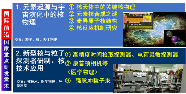 n粒子物理与原子核物理学科世界科技前沿,服务国家发展战略、培养国防紧缺型人才,以理论核物理与计算物理、基于大型科学装置的核物理、核天体物理、高能物理与粒子物理实验等方面的若干前沿领域取得了许多重要研究成果,在国际著名学术刊物上发表了一批高水平学术论文,在Physical Review Letters上发表了近十篇重要文章,整体科研实力稳步提升,逐步形成了前沿基础和交叉学科研究紧密结合的学科布局,已形成元素起源与宇宙演化中的核物理、强子物理、TeV物理、新型探测器研制、核技术应用、医学物理等6个具有优势、特色鲜明的研究方向,参与建设国家十二五期间重大科技基础设施-HIAF等,是国际多个合作项目CMS、BESIII、Super-FRS、ILIMA、BELLE(II)等的合作组成员。